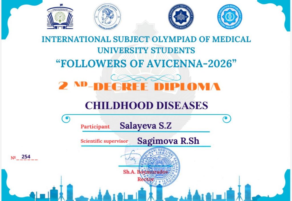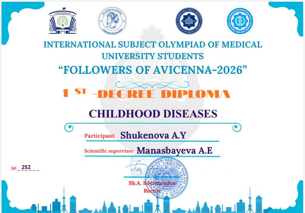 ППС Ташкентского государственного медицинского университета организовали онлайн среди студентов медицинских ВУЗов — Международную предметную Олимпиаду “Последователи Авиценны-2026”, которая состоялся 31 марта 2026 года. По дисциплине «Педиатрия» Призовое Первое место заняла студентка 5курса, группы П-21-017р, научный руководитель, ассистент профессора кафедры Детских болезней им проф. Н.А.Барлыбаевой, магистр мед наук Манасбаева Арайлы Елубаевна.