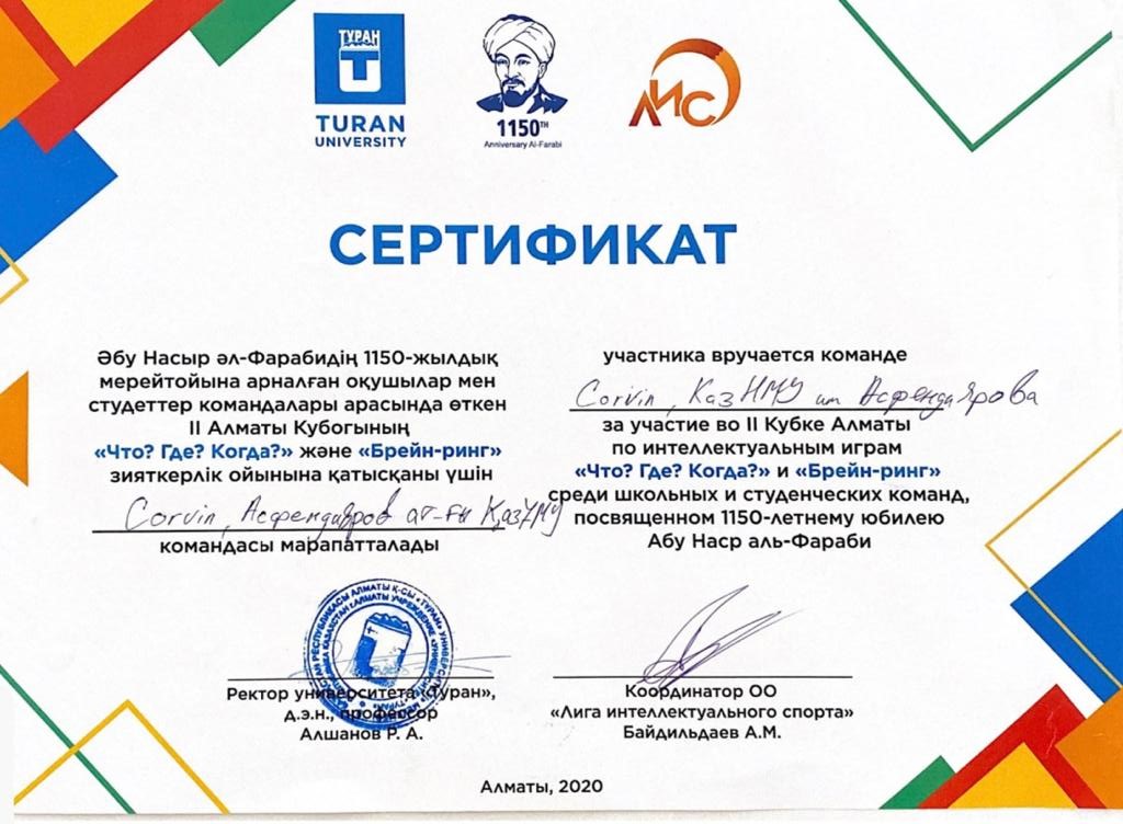 За ИК такие победы как: 3 место на Первом Кубке Алматы по интеллектуальным играм Что?Где?Когда?, который проводился на территории университета «Туран», 3 место в Первом Городском Отборочном Турнире по Брейн рингу, в КазНУ им Аль-Фараби и 2 место во Втором Отборочном Турнире и 1 место в Третьем Отборочном Турнире по Брейн рингу.