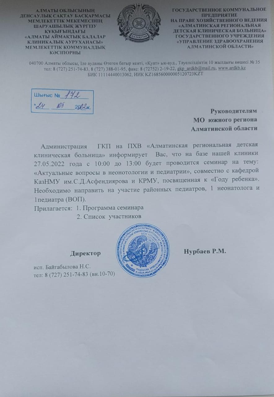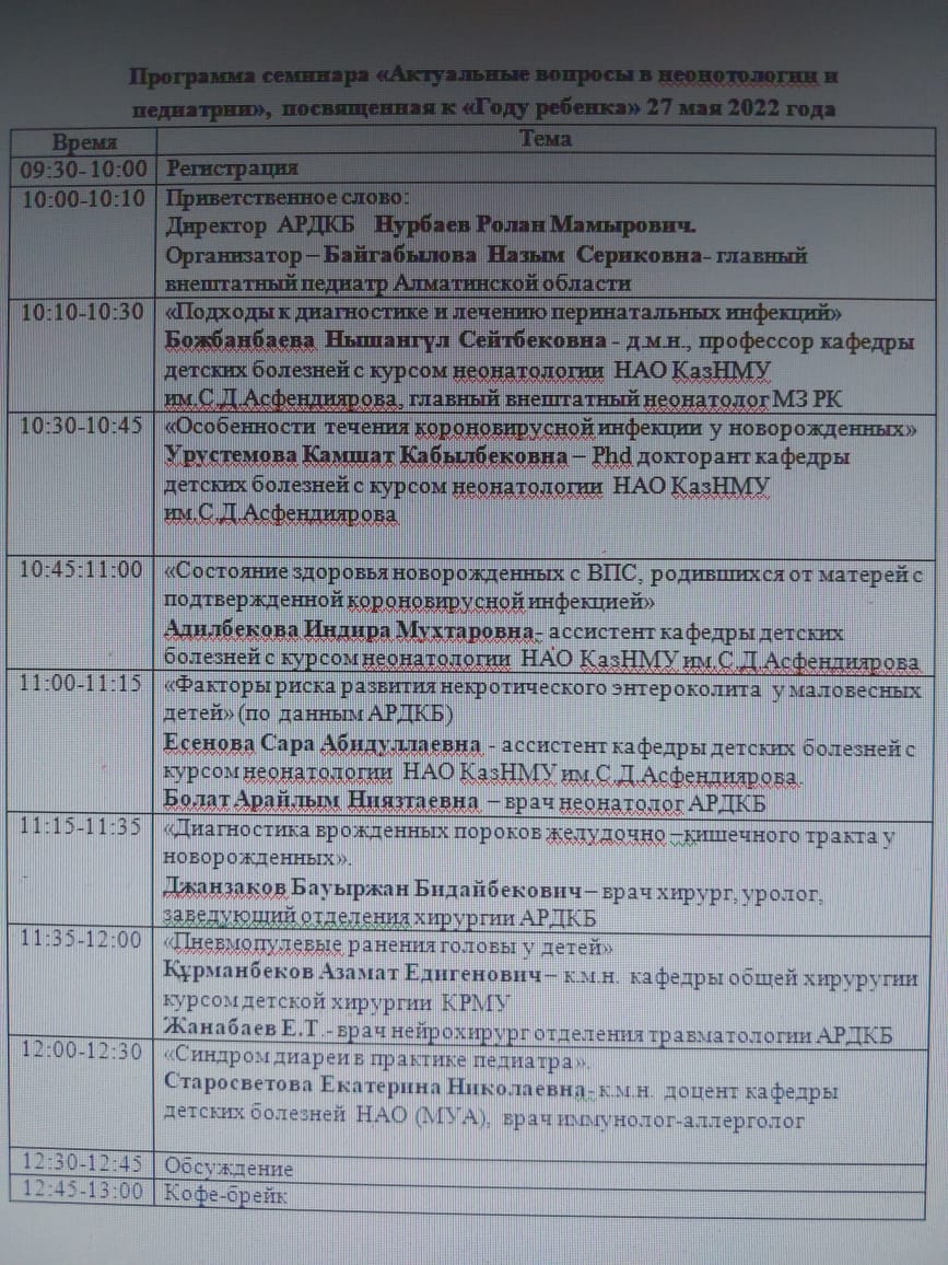 27.05.2022 күні «Балалар жылына» орай, «1 маусым – балаларды қорғау» күні мерекесінің қарсаңында, Н.А.Барлыбаева атындағы балалар аурулары неонатология курсымен кафедрасы қызметкерлері профессор м.ғ.д. Божбанбаева Н.С. жетекшілігімен, «Алматы аймақтық балалар клиникалық ауруханасымен» бірлесіп, Алматы облысының аймақтық дәрігерлерді шақырып «Неонатология және педиатрия саласындағы өзекті мәселелер» тақырыбында семинар ұйымдастырылды. Онда неонатология, педиатрия және хирургия саласының өзекті мәселелері қызу талқыға түсті.